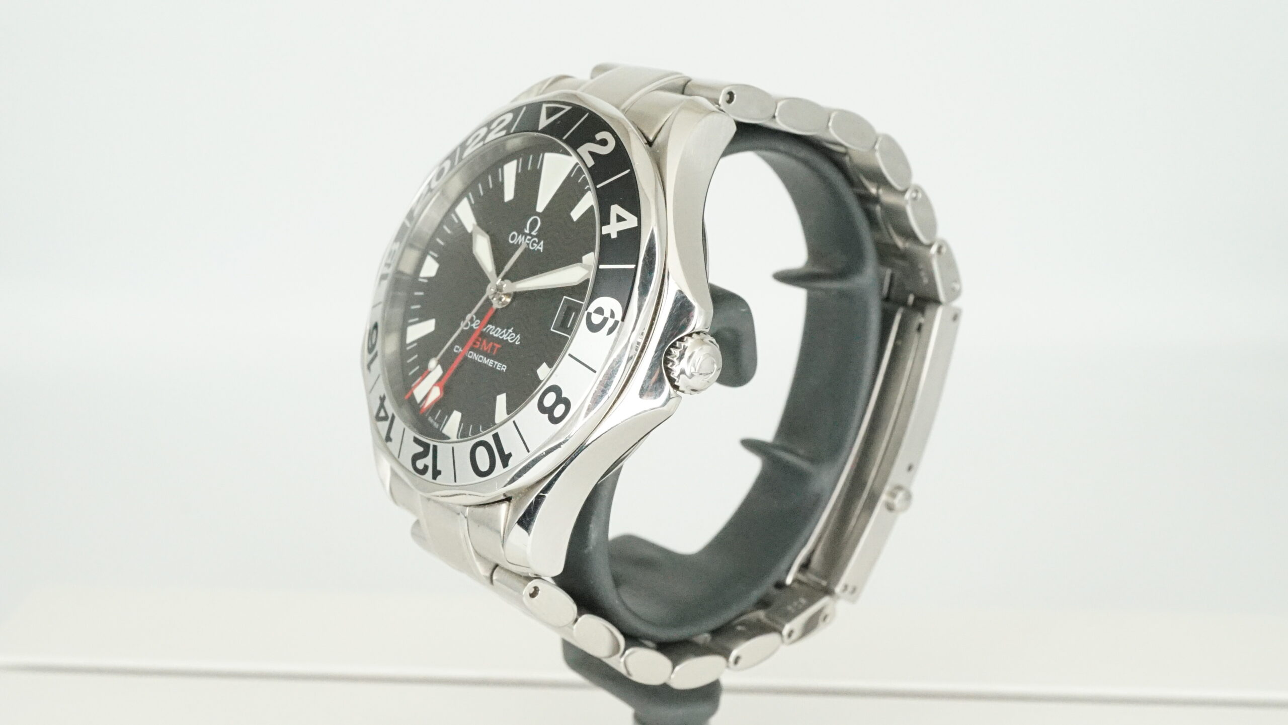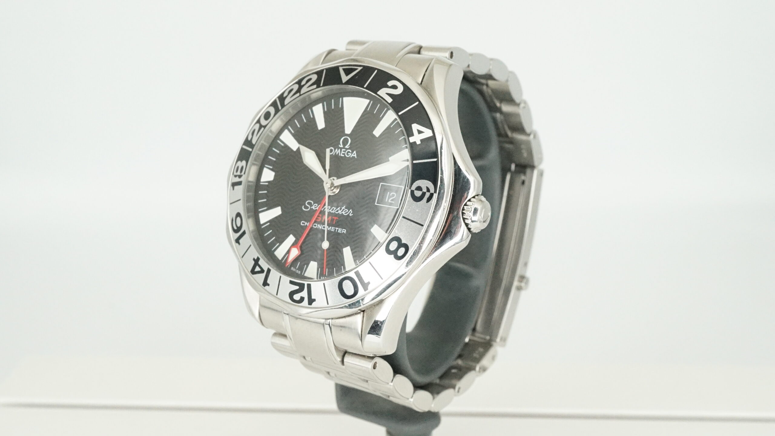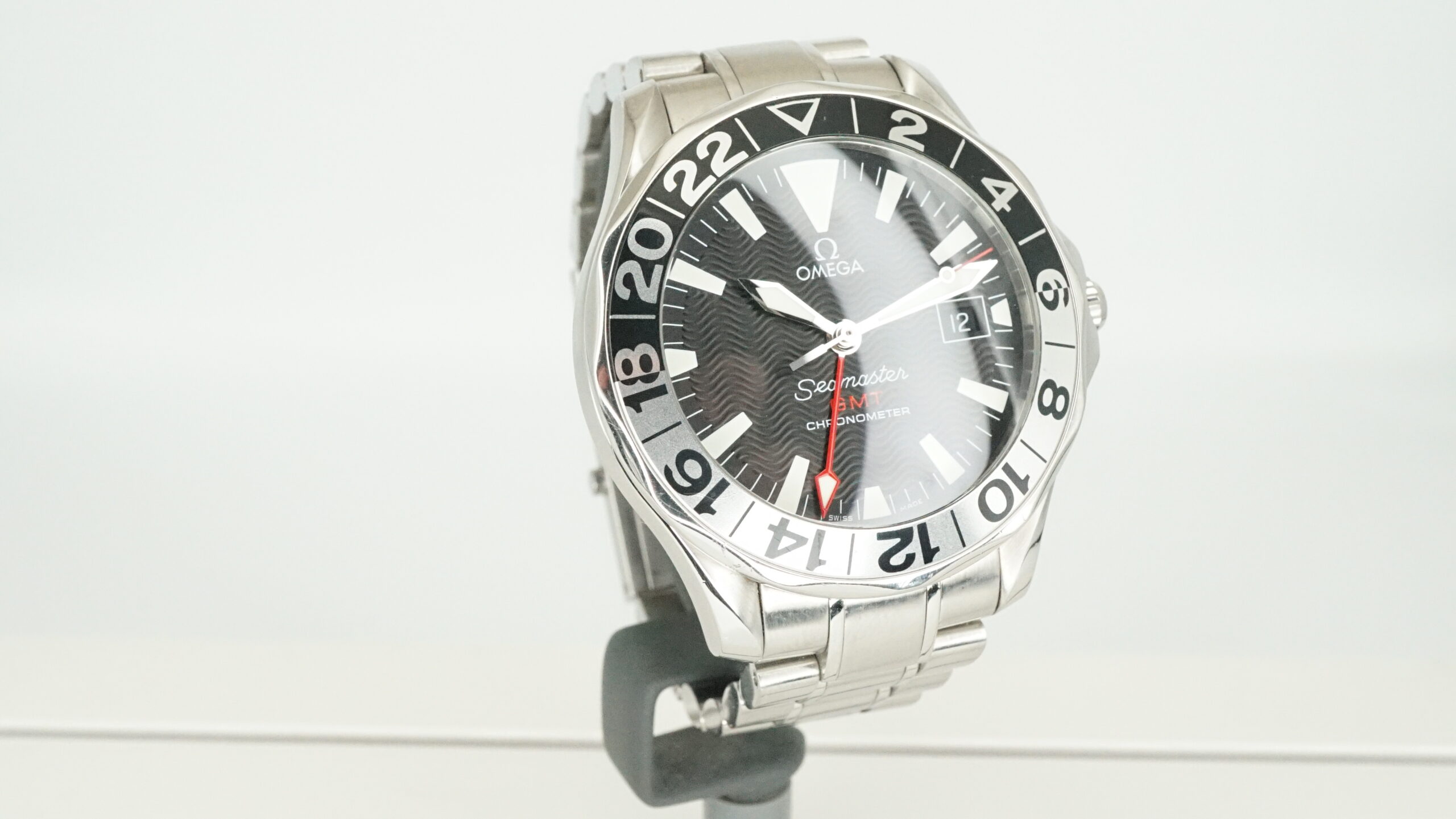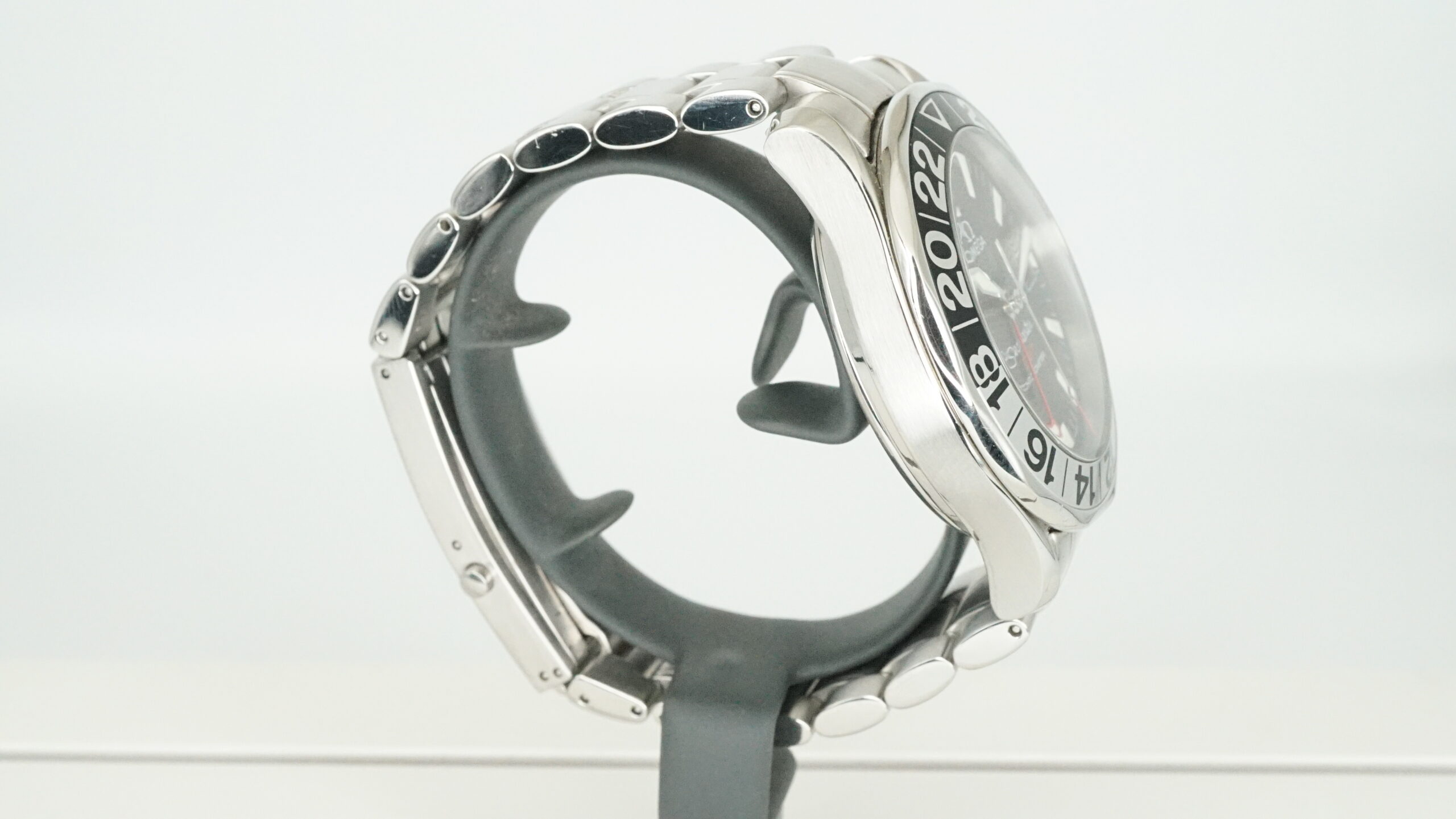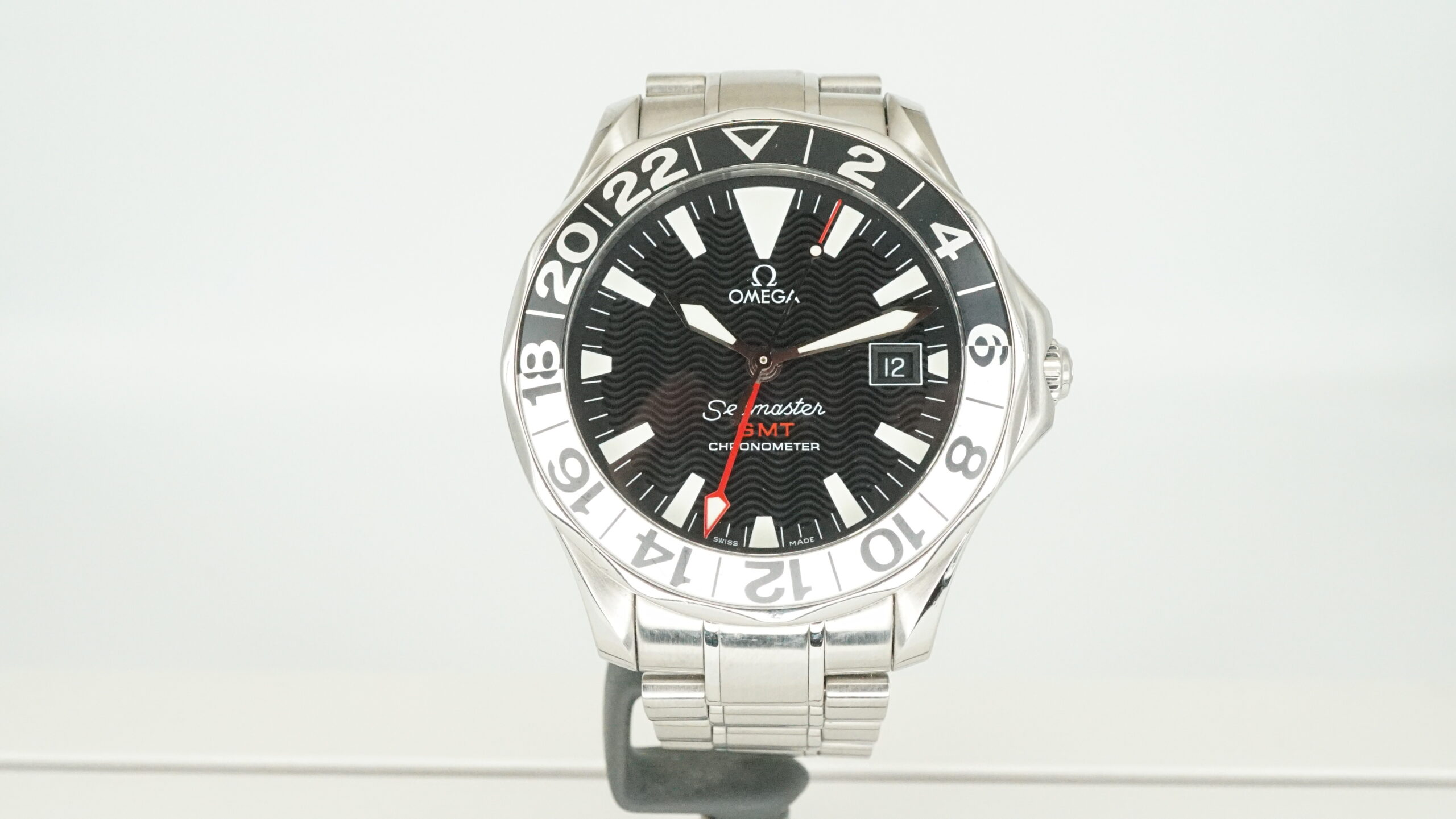 This special edition blends classic Seamaster DNA with modern functionality, including a GMT complication for tracking a second time zone — perfect for travelers and professionals. Housed in a 41.5 mm stainless steel case, it features a black wave-pattern dial, bold 24-hour rotating bezel, and is powered by the automatic Omega Caliber 1128.